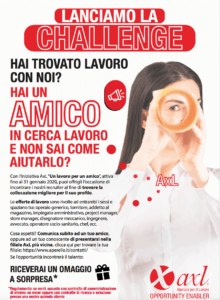 AxL e opportunità. Un binomio in continua crescita, su tutto il territorio nazionale, laddove AXL lavora in sinergia tra aziende e candidati. Opportunità, per l’appunto. Come l’ultima challenge “Un lavoro per un amico”, nata dalla volontà di allargare la rete o offrire nuove possibilità lavorative.